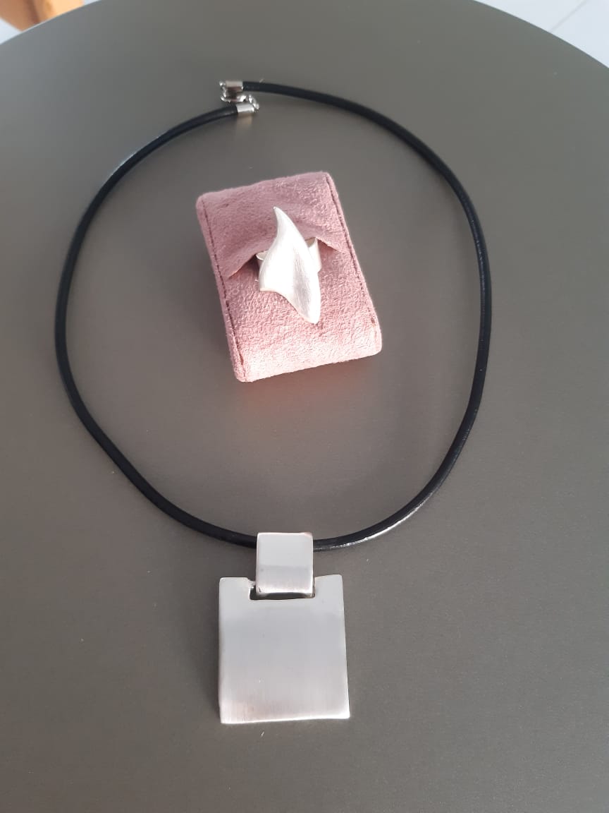 Colar em fio de couro e pingente em estanho e banho de prata.