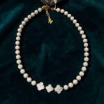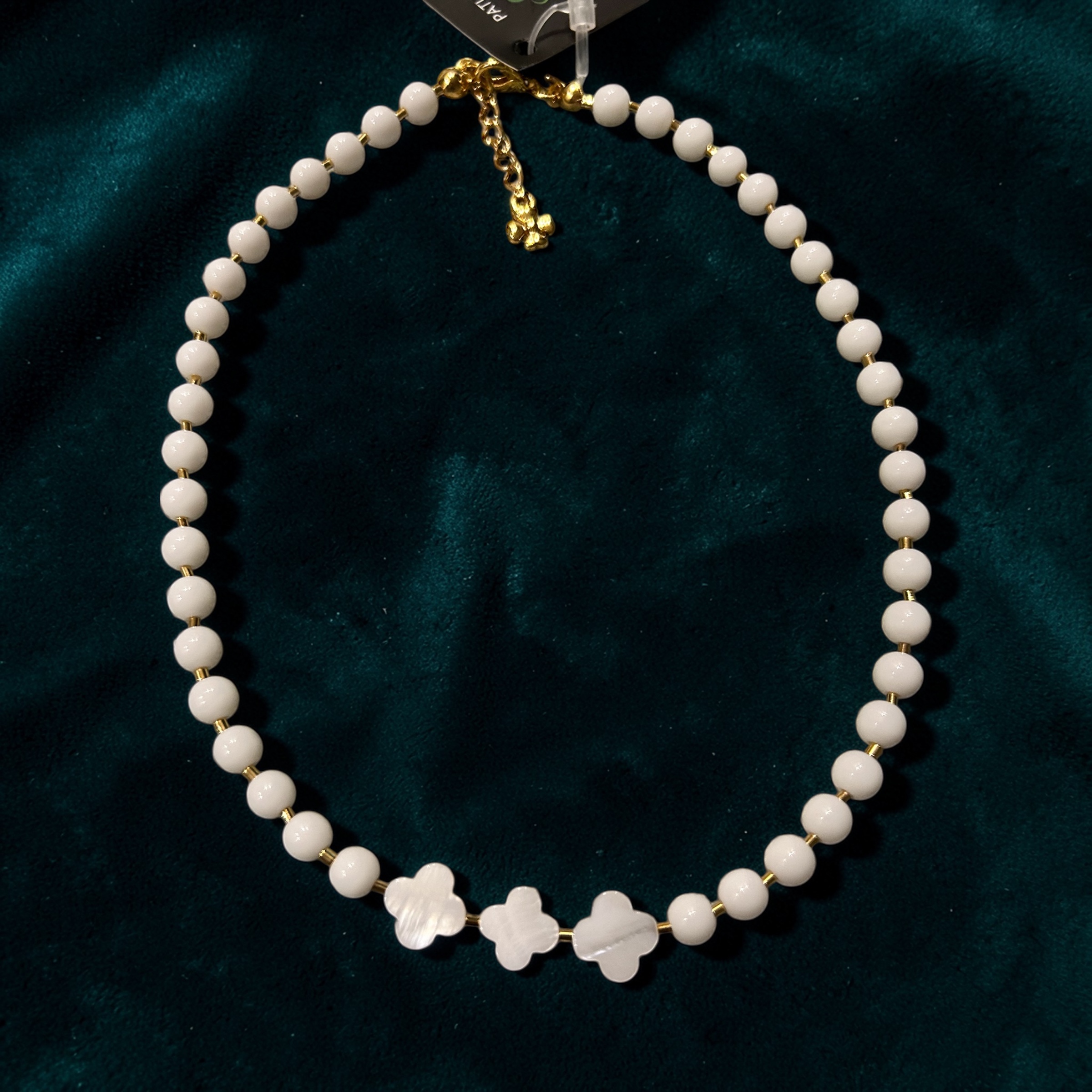 Colar de pedras brancas (esferas), flor de madre pérolas com mini entremeios de metal dourados
