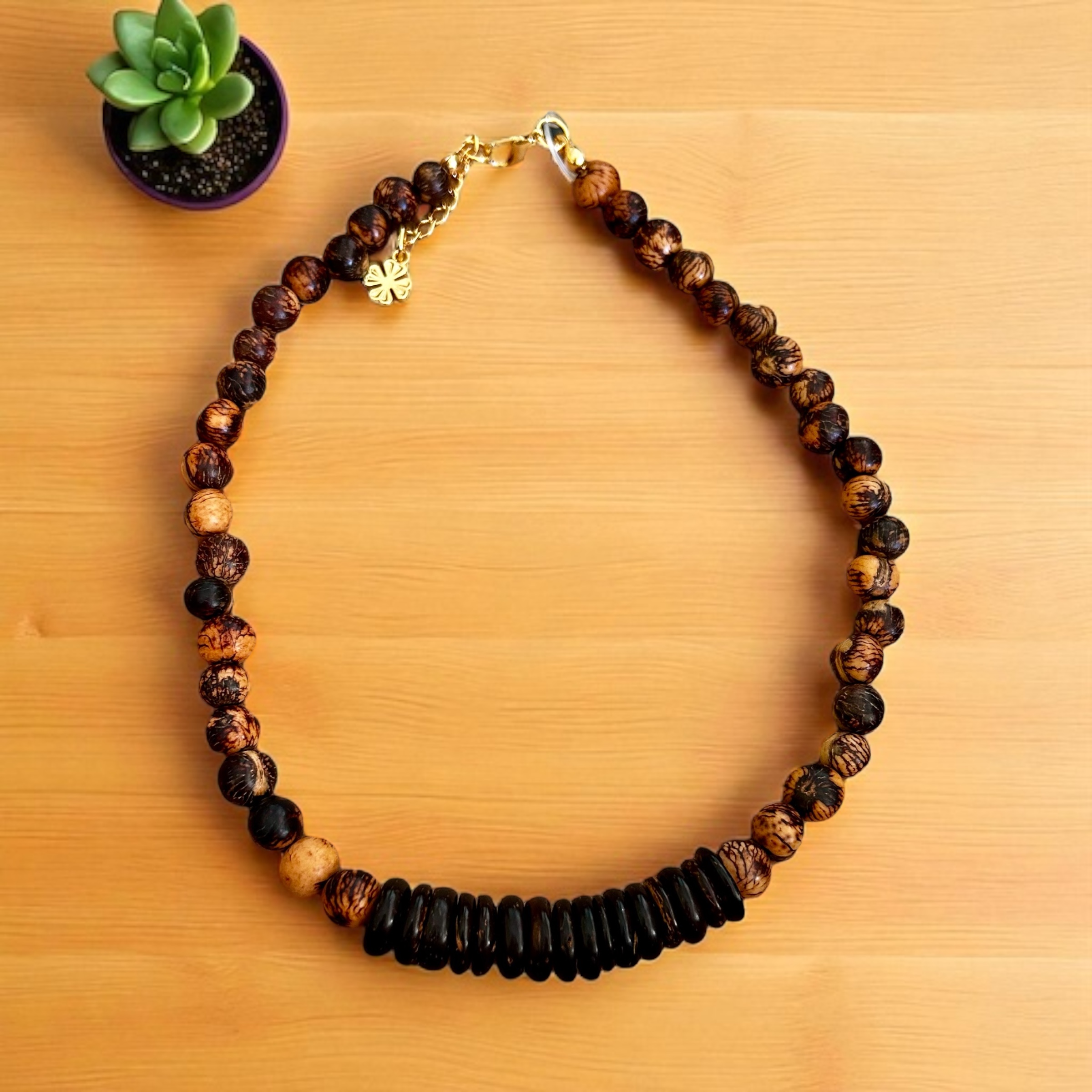 Colar curto com peças em madeira