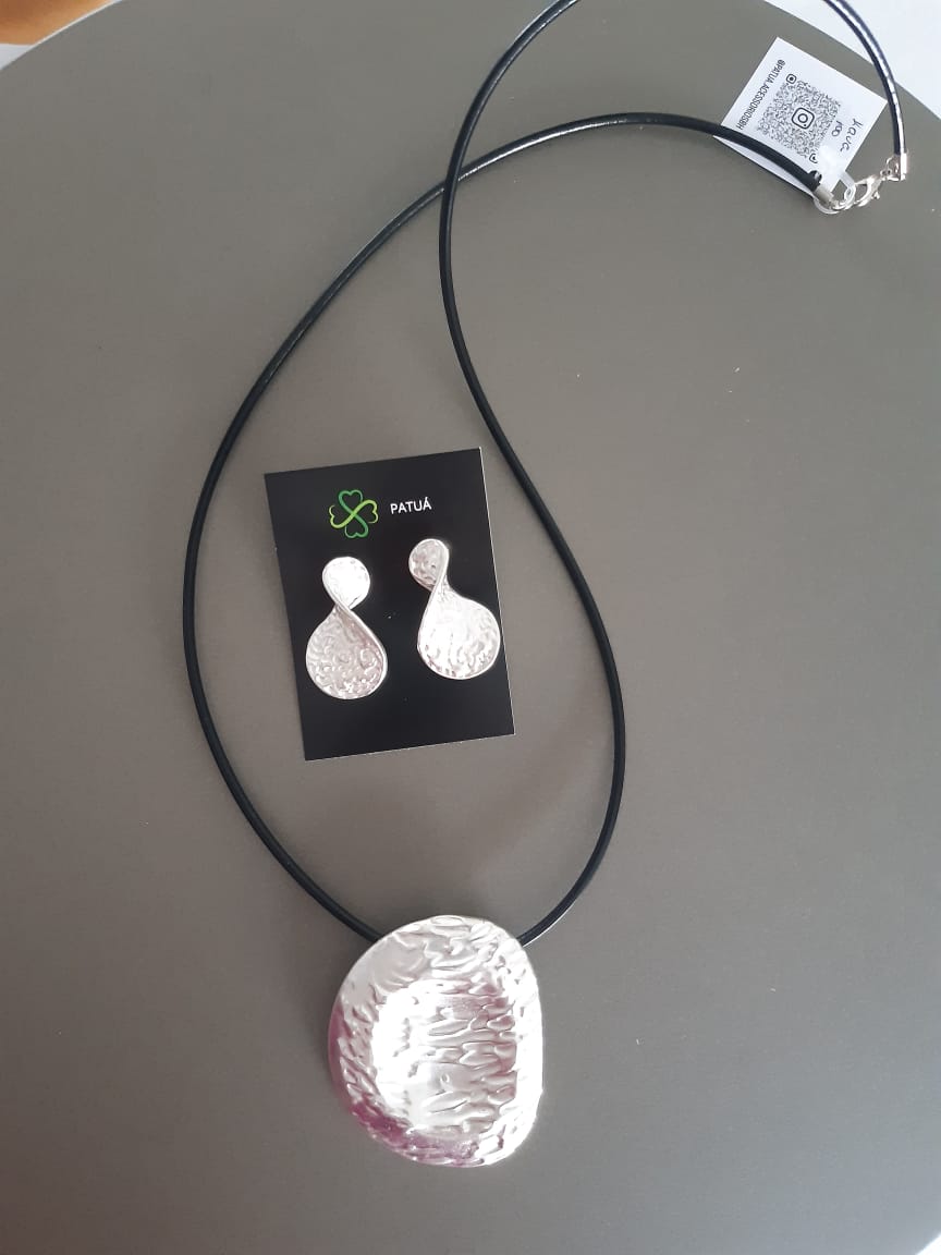 Colar longo em fio de couro e pingente em estanho e banho de prata.