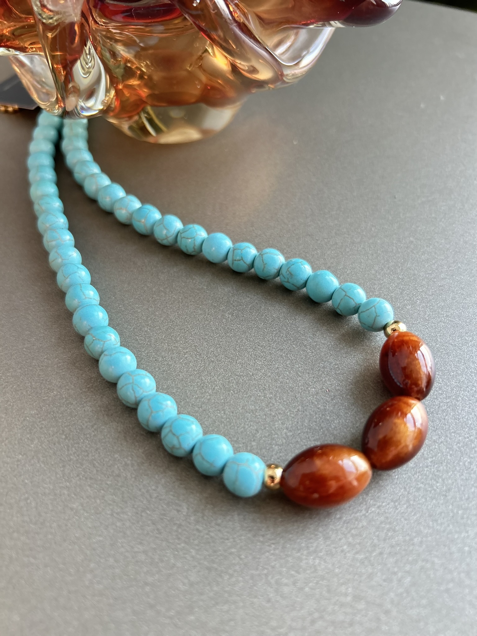 Colar curto e, resinas azul turquesa e tartaruga.