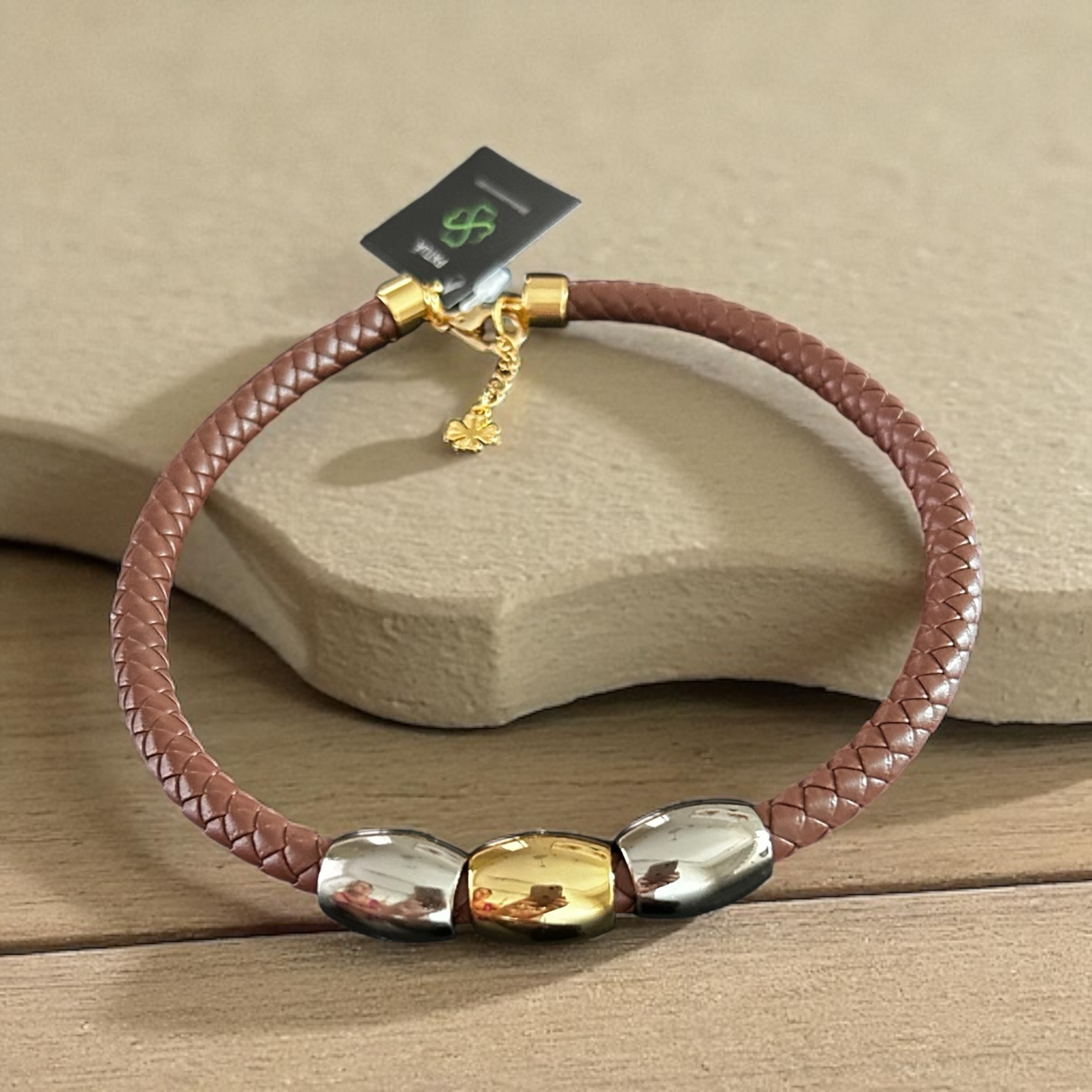Colar curto em couro com peças dourada e prateadas