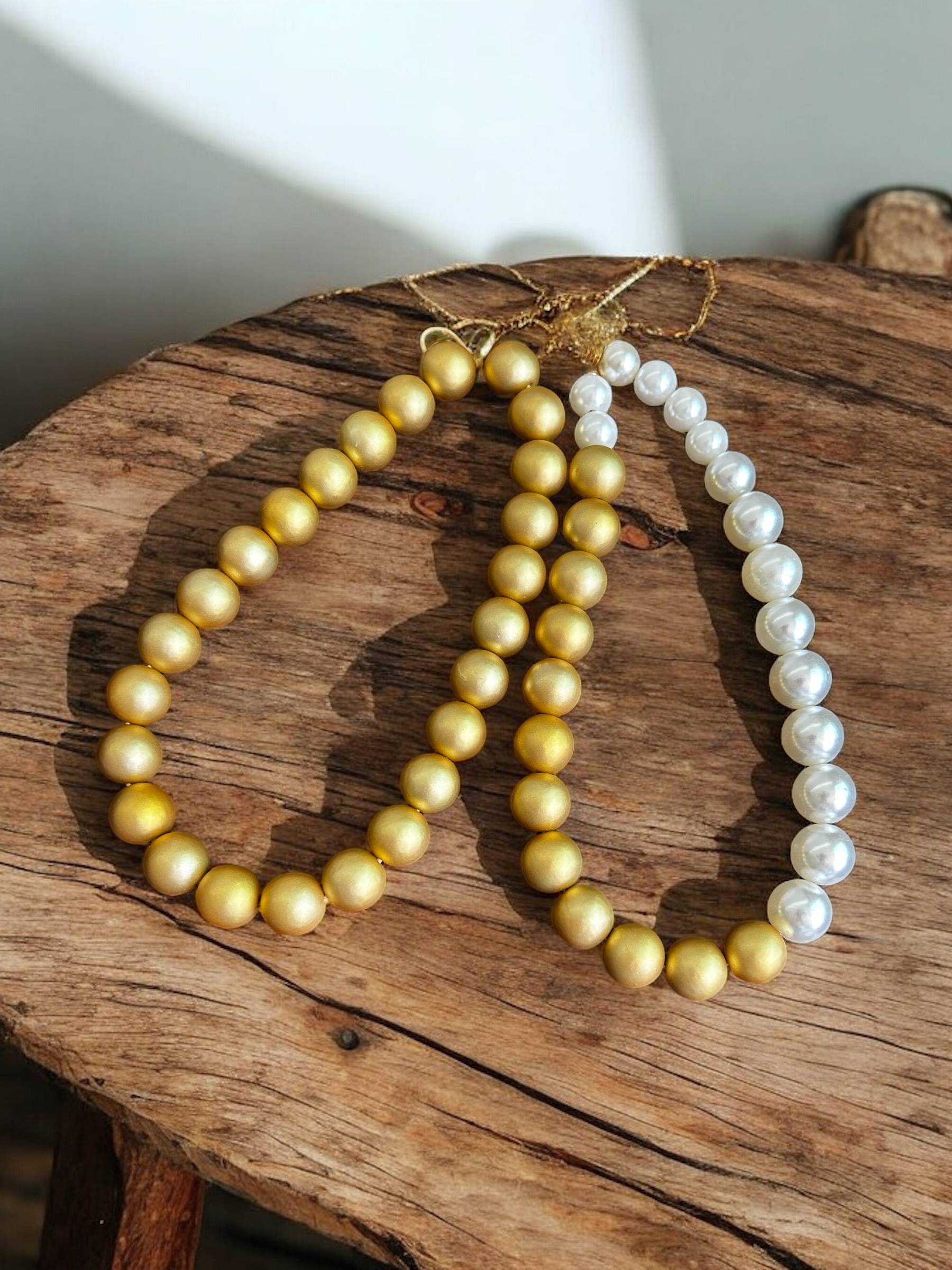 Colar curto de perolas douradas.