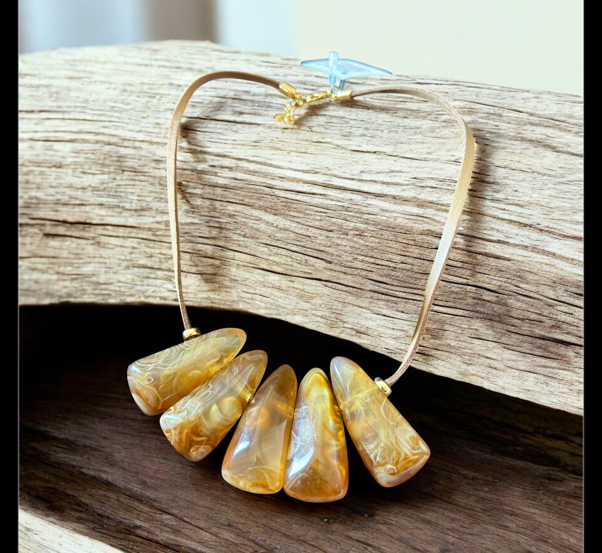Colar curto em fio de camurça e resinas na cor tartaruga.