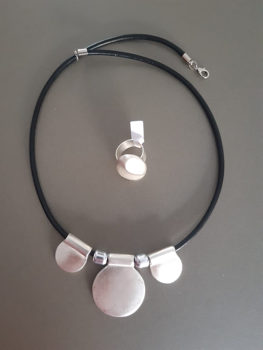 Colar em fio de couro e pingente em estanho e banho de prata.